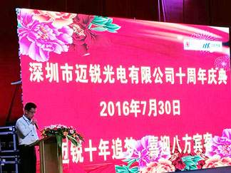 2016年7月30日,深圳市mile米乐光电有限公司(以下简称mile米乐光电)内外鲜花灿漫、彩旗招展、气球高悬,迎来了公司十周年华诞。为了感谢新老客户的支持,在惠州皇冠假日酒店举行了一场庆典活动,公司全体领导、客户与合作伙伴齐聚一堂,共赴繁花似锦的十年之约。